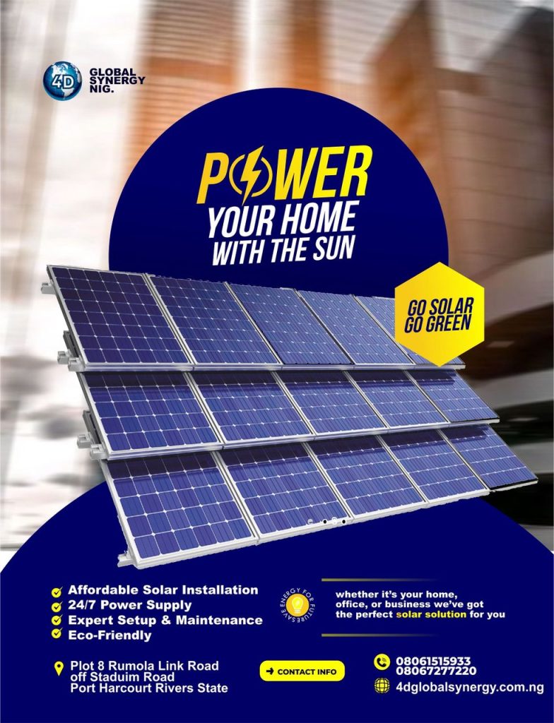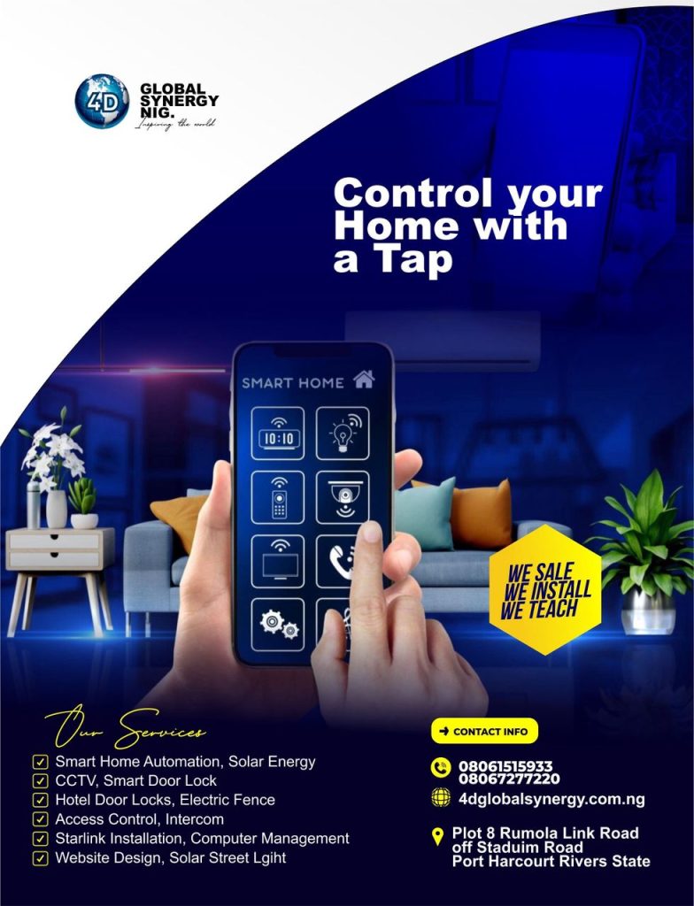 4D Global Synergy Nigeria Limited is an innovative indigenous company specializing in both smart home automation and solar energy solutions. With a mission to revolutionize the way Nigerian homes and businesses interact with technology and energy, 4D Global Synergy integrates smart living systems with renewable energy sources, enhancing comfort, security, and sustainability. By providing state-of-the-art solar-powered solutions and intelligent automation, the company aims to offer cost-effective, eco-friendly, and efficient systems that meet the unique demands of the modern Nigerian consumer.